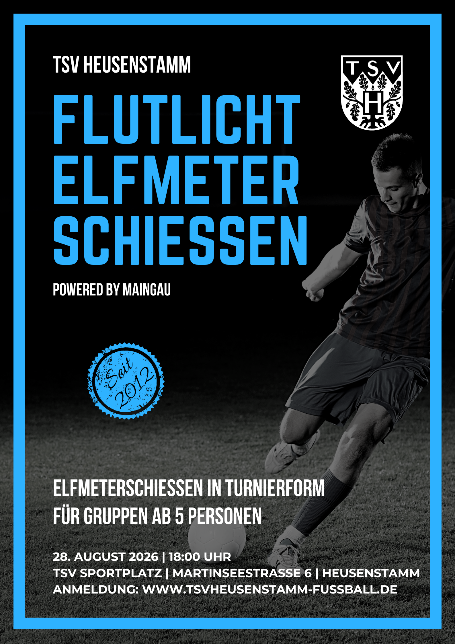 Die Fußballabteilung der TSV Heusenstamm veranstaltet am Freitag, den 28. August 2026 das 12. Heusenstammer Flutlichtelfmeterschießen „powered by MAINGAU“. Turnierbeginn ist um 19:00 Uhr. Der TSV Sommergarten hat bereits ab 18:00 Uhr geöffnet und bietet leckeres vom Grill sowie gekühlte Getränke. Bei der letzten Veranstaltung hatten sich 64 Mannschaften für das Turnier angemeldet. Das Flutlichtelfmeterschießen wird in Turnierform gespielt. Pro Mannschaft werden 5 Personen benötigt. Egal ob Verein, Firma oder sonstige Gruppierung, jeder kann sich anmelden. Es können Frauen-, Männer- und Mixed-Teams an den Start gehen. Es wird eine Startgebühr von 30,- Euro erhoben. Darin sind 20,- Euro Wertbons enthalten, die an den TSV Ständen eingelöst werden können. Anmeldungen sind ab Juni 2026 hier an dieser Stelle möglich.